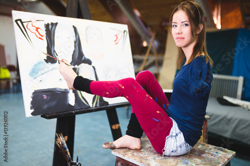 © hedgehog94, Naklejka premium Disabled beautiful young artist painting incredible scenes in attic by holding paintbrush in her toes.