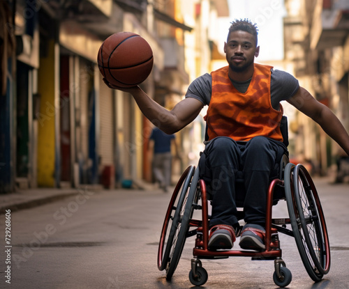 © artsterdam, Fototapeta premium Disabled man in a wheelchair plays basketball on the street. Equal opportunity concept