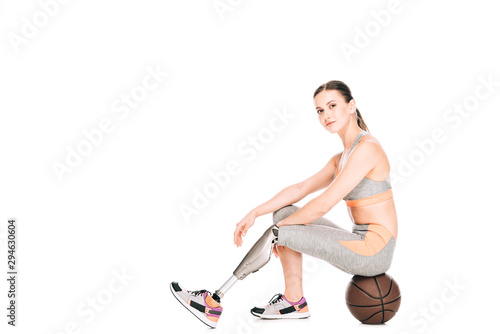 Fototapeta premium disabled sportswoman sitting on basketball ball isolated on white