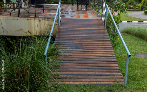 © kanpisut, Fototapeta premium Disabled way in front of building. Handicapped traffic symbol on the floor in front of ramp way for support wheelchair. Disabled way in front of cafe on green nature landscape.