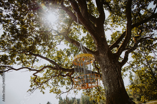 Fototapeta premium disc golf basket is hanging from the oak tree