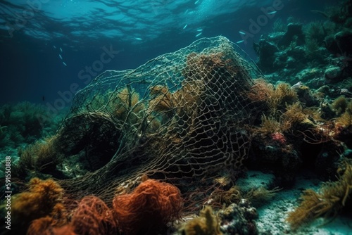 Fototapeta premium Discarded Fishing Net In Coral Reef. Generative AI