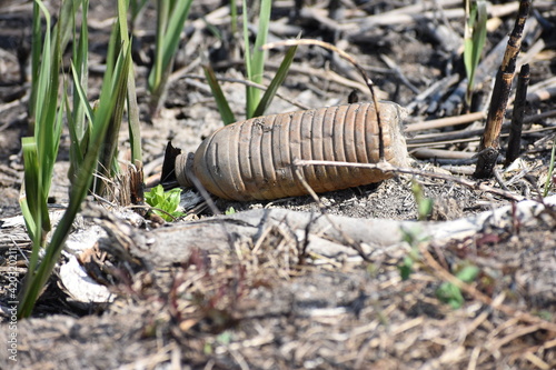 Obraz premium Discarded plastic bottle laying in bay creating environmental litter and waste