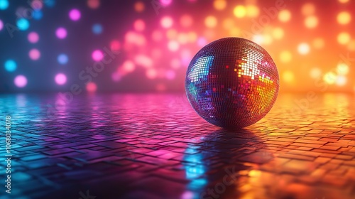 Fototapeta premium Disco mirror ball on a bright rainbow background with lights, representing retro dance parties.