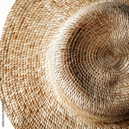 © AEIOU, Fototapeta premium Discover a chic and sun-safe wide-brimmed summer hat in detailed close-up, featuring woven texture under bright light.