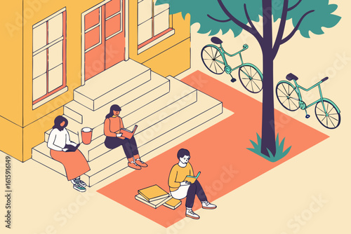 © Alex, Obraz premium Discover Dutch students relaxing on a sunny square in the Netherlands with books, coffee, and bicycles in modern flat illustration style.