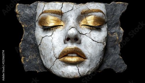 © Supanan, Naklejka premium Discover the allure of an Artistic Portrait with Gold Details, a masterpiece embodying minimalist vibes and contemporary elegance This captivating artwork showcases a cracked mask effect, accentuated