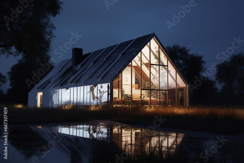 © Arkane, Obraz premium Discover the beauty of a contemporary single-roof house embraced by nature. A modern retreat in a peaceful natural landscape Created with generative AI tools.