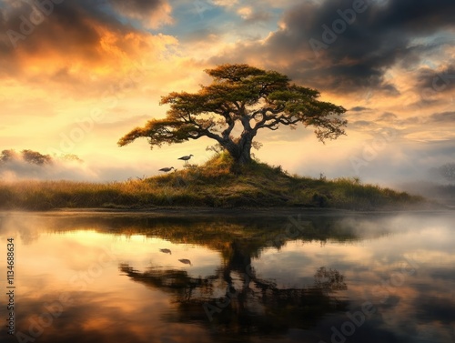 Fototapeta premium Discover the beauty of nature's art with a photographer capturing rare birdlife in wetlands, a meditative wildlife artistry Witness breathtaking wildlife photography at dawn observe majestic herons