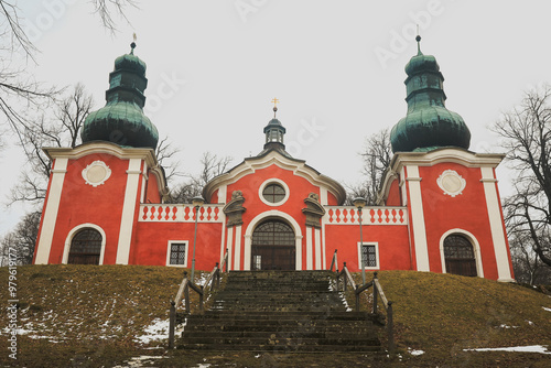 © Dave, Obraz premium Discover the unique architecture of the Calvary in Banska Stiavnica, Slovakia, set against a winter landscape with historical significance