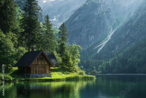 Fototapeta premium Discover tranquility at a serene cabin by a mountain lake surrounded by lush greenery, Cabin by a mountain lake with lush green surroundings Scenic mountain retreat concept