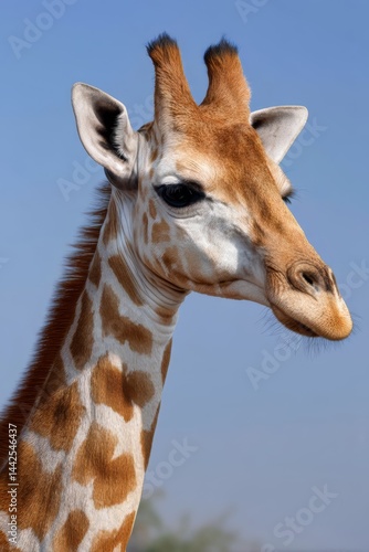 © J. Thamanoon, Fototapeta premium Discovering the Majestic Giraffe Standing Gracefully Amidst Lush Green Grass and Blue Skies