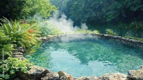 Naklejka premium Discovering the Serenity of a Luxurious Hot Spring Enveloped in Lush Greenery...
