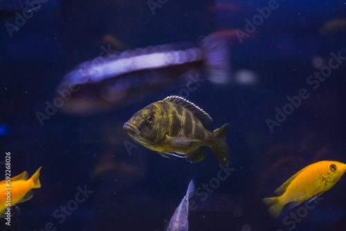 Naklejka premium Discus, colorful cichlids in the aquarium, freshwater fish that lives in the Amazon basin. Colored, bright fish in the aquarium. A variety of marine fish.