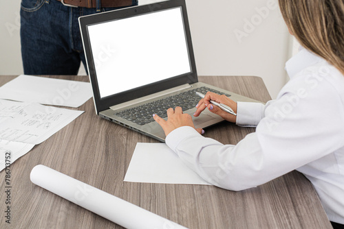 © JulianSarmiento, Fototapeta premium Discussion of projects and strategies. A business meeting at an engineering firm, where professionals discuss projects and delivery dates.