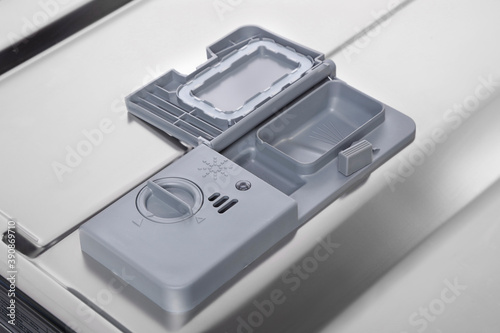 Fototapeta premium Dishwasher detergent powder tank with steel base
