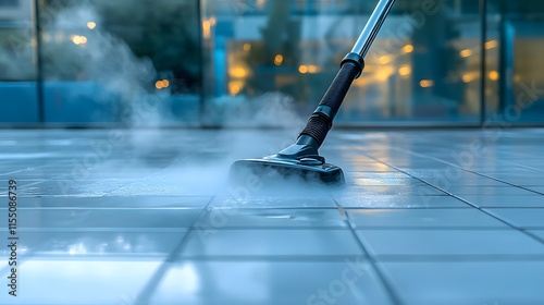 Fototapeta premium Disinfecting surfaces with steam creates a clean, fresh environment, highlighting reflections and a cool blue ambiance.