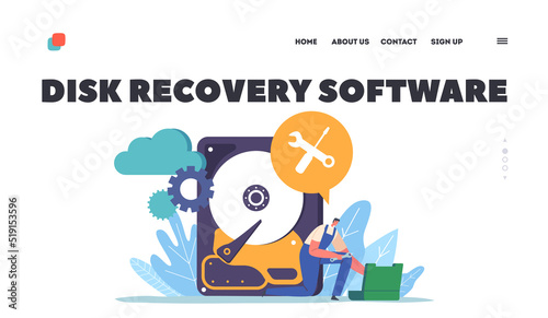 © Pavlo Syvak, Obraz premium Disk Recovery Software Landing Page Template. Backup, Data Protection, Hardware Repair. Tiny Worker Fixing Broken Hd