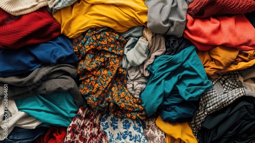 Fototapeta premium Disorganized stack of clothes piled haphazardly in a chaotic arrangement