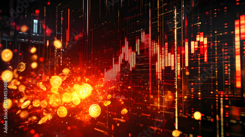 © Marut, Obraz premium display of stock prices glitching and exploding into golden coins and red sparks