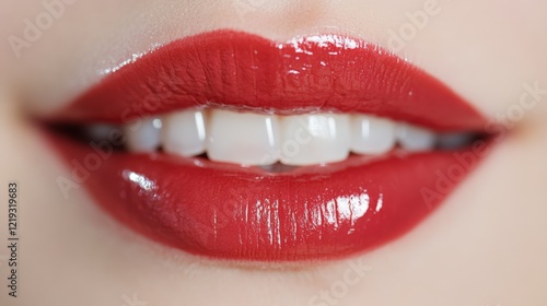 Obraz premium Displaying a perfect smile with white, healthy, straight teeth and full, glossy red lips, embodying sensuality, beauty, and the essence of cosmetology and dental care