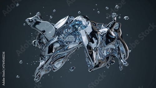 Fototapeta premium Displaying abstract chrome liquid sculpture in digital studio environment, with floating droplets