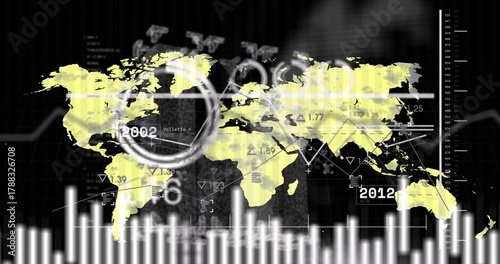 Obraz premium Displaying analytics dashboard featuring yellow world map with circular scan ring and histogram