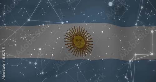 © vectorfusionart, Obraz premium Displaying Argentine flag across dark bluish backdrop, showing golden Sun of May, net overlay