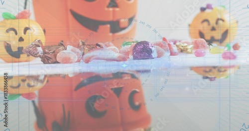 Fototapeta premium Displaying assorted Halloween candies and jack-o'-lantern buckets on glossy...