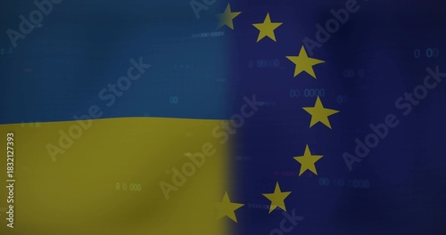 Fototapeta premium Displaying banner merging Ukraine bicolor with EU blue field, showing gold stars, seam, numeric