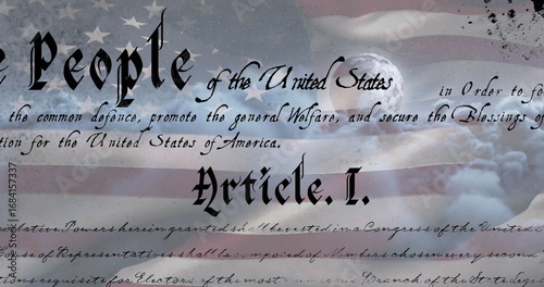 © vectorfusionart, Fototapeta premium Displaying blackletter Article I preamble floating in digital art, showing flag and ink splatters
