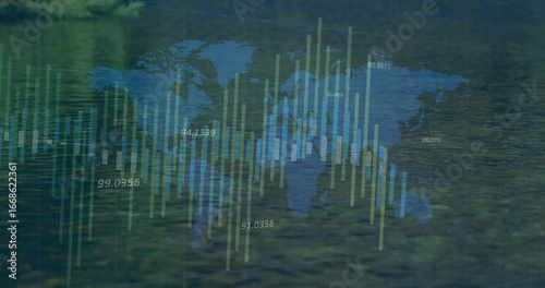 Naklejka premium Displaying blue world map overlaying rippling lake water, with green yellow bars and numeric labels