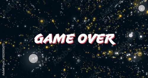 Fototapeta premium Displaying bold GAME OVER text floating in dark navy starfield, showing pink shadow and pale orbs