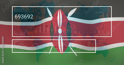 Naklejka premium Displaying central Maasai shield and crossed spears in digital infographic, with HUD panels