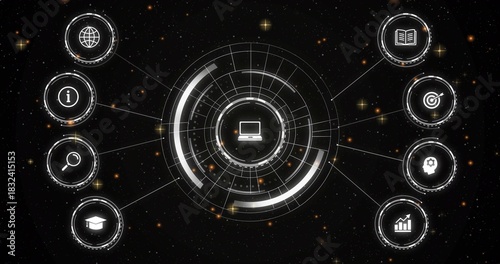 © vectorfusionart, Obraz premium Displaying central multi-ring HUD with laptop icon in dark starfield, showing eight satellite nodes
