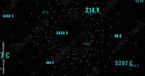 Fototapeta premium Displaying central wireframe tunnel receding into black void in virtual data, with currency labels