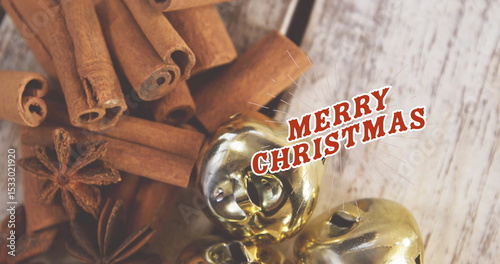 Obraz premium Displaying cinnamon sticks, anise pods, golden bells on wood surface with red Merry Christmas text