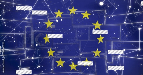 Obraz premium Displaying circle of twelve yellow stars on dark blue network, with white nodes and hatched panels