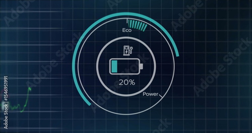 © vectorfusionart, Obraz premium Displaying circular battery gauge showing 20% charge and plug icon on dashboard, with Eco Power