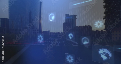 © vectorfusionart, Obraz premium Displaying city skyline in urban plaza at dusk, featuring glowing cogwheels, waveform and globe map