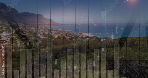 Naklejka premium Displaying coastal town from hillside viewpoint, showing candlestick charts...