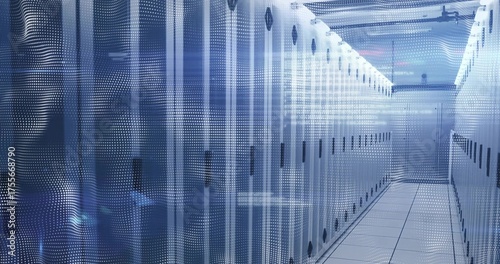 Fototapeta premium Displaying corridor flanking server cabinets in data center, with LED lights,...