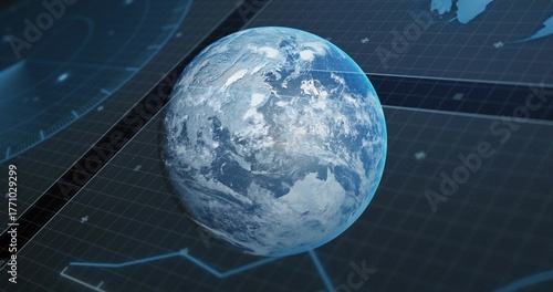 Fototapeta premium Displaying 3D Earth globe floating above grid plane in futuristic data visualization, UI overlays