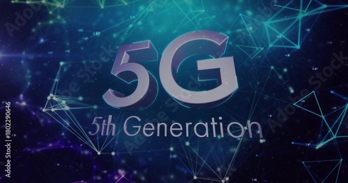 Fototapeta premium Displaying 3D 5G typography with 5th Generation subtitle centered in virtual space, glowing nodes