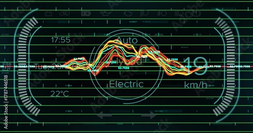 © vectorfusionart, Obraz premium Displaying digital cluster on car dashboard showing central Electric Auto gauge, color waves, speed