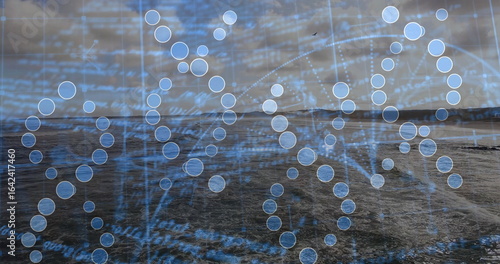 Obraz premium Displaying digital DNA helix floating over sea at dusk, with nodes, grid lines and code text