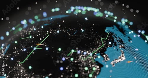 © vectorfusionart, Naklejka premium Displaying digital globe rotating in dark void, showing city lights, neon lines, nodes, cyan mesh