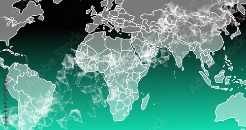 Naklejka premium Displaying digital map showing white continent outlines over green-black gradient with mesh nodes