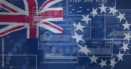 © vectorfusionart, Obraz premium Displaying digital montage merging Union Jack and EU stars on dark blue UI, showing UI panels