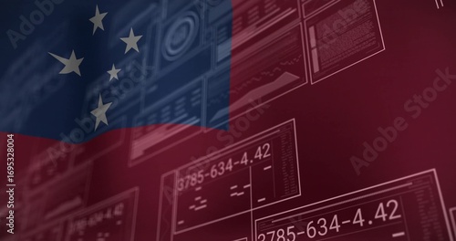 © vectorfusionart, Naklejka premium Displaying digital Samoan flag on red-blue gradient, with translucent panels showing numeric codes